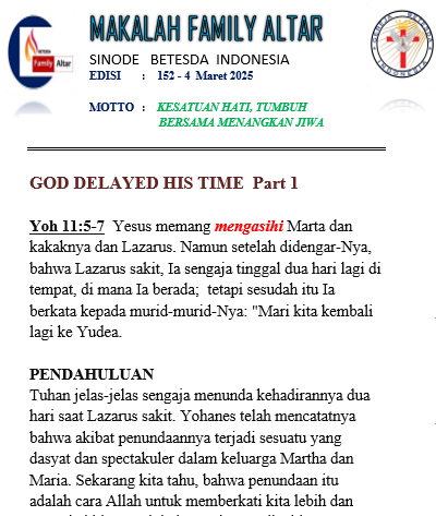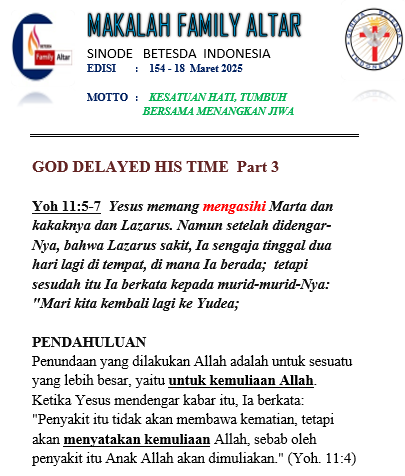 Yoh 11:5-7  Yesus memang mengasihi Marta dan kakaknya dan Lazarus. Namun setelah didengar-Nya, bahwa Lazarus sakit, Ia sengaja tinggal dua hari lagi di tempat, di mana Ia berada;  tetapi sesudah itu Ia berkata kepada murid-murid-Nya: "Mari kita kembali lagi ke Yudea. PENDAHULUAN Tuhan jelas-jelas sengaja menunda kehadirannya dua...