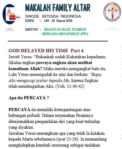 Jawab Yesus: "Bukankah sudah Kukatakan kepadamu: Jikalau engkau percaya engkau akan melihat kemuliaan Allah? Maka mereka mengangkat batu itu. Lalu Yesus menengadah ke atas dan berkata: "Bapa, Aku mengucap syukur kepada-Mu, karena Engkau telah mendengarkan Aku. (Yoh. 11:40-42)   Apa itu PERCAYA ?   PERCAYA itu memiliki ketergantungan atau...