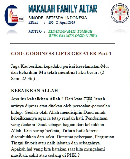 Juga Kauberikan kepadaku perisai keselamatan-Mu, dan kebaikan-Mu telah membuat aku besar. (2 Sam. 22:36 ).   KEBAIKKAN ALLAH Apa itu kebaikkan Allah ? Dari kata עָנָה `anah artinya dipress atau ditekan oleh persoalan-persoalan hidup.  Seolah-olah Allah mendisiplin Daud untuk kebaikkannya agar ia tetap rendah hati. Penderitaan yang dialami...