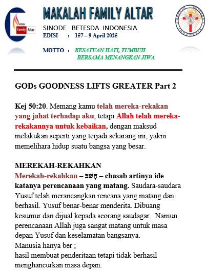 Kej 50:20. Memang kamu telah mereka-rekakan yang jahat terhadap aku, tetapi Allah telah mereka-rekakannya untuk kebaikan, dengan maksud melakukan seperti yang terjadi sekarang ini, yakni memelihara hidup suatu bangsa yang besar.   MEREKAH-REKAHKAN Merekah-rekahkan – חָשַׁב – chasab artinya ide katanya perencanaan yang matang. Saudara-saudara Yusuf telah merancangkan...