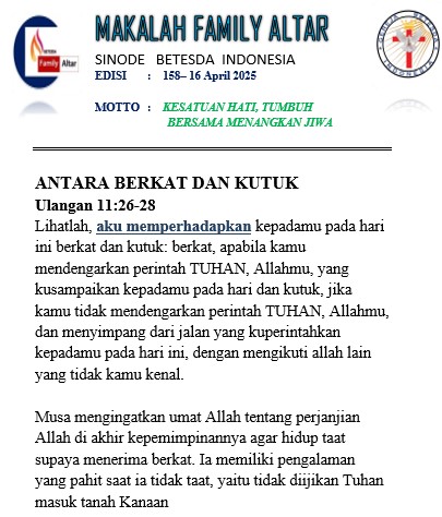 Ulangan 11:26-28 Lihatlah, aku memperhadapkan kepadamu pada hari ini berkat dan kutuk: berkat, apabila kamu mendengarkan perintah TUHAN, Allahmu, yang kusampaikan kepadamu pada hari dan kutuk, jika kamu tidak mendengarkan perintah TUHAN, Allahmu, dan menyimpang dari jalan yang kuperintahkan kepadamu pada hari ini, dengan mengikuti allah lain...