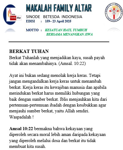 Berkat Tuhanlah yang menjadikan kaya, susah payah tidak akan menambahinya. (Amsal. 10:22)   Ayat ini bukan sedang menolak kerja keras. Tetapi jangan mengandalkan kerja keras untuk menambah berkat. Kerja keras itu kewajiban manusia dan apabila merindukan berkat harus memiliki hubungan yang baik dengan sumber berkat. Iblis menjauhkan...