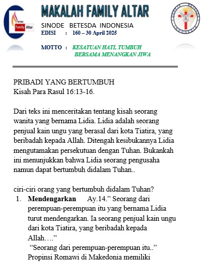 Kisah Para Rasul 16:13-16.   Dari teks ini menceritakan tentang kisah seorang wanita yang bernama Lidia. Lidia adalah seorang penjual kain ungu yang berasal dari kota Tiatira, yang beribadah kepada Allah. Ditengah kesibukannya Lidia  mengutamakan persekutuan dengan Tuhan. Bukankah ini menunjukkan bahwa Lidia seorang pengusaha namun dapat...