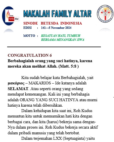 Berbahagialah orang yang suci hatinya, karena mereka akan melihat Allah. (Matt. 5:8 )   Kita sudah belajar kata Berbahagialah, yait μακάριος – MAKARIOS – Ide katanya adalah SELAMAT. Atau seperti orang yang sedang mendapat kemenangan. Kali ini yang berbahagia adalah ORANG YANG SUCI HATINYA atau murni hatinya...