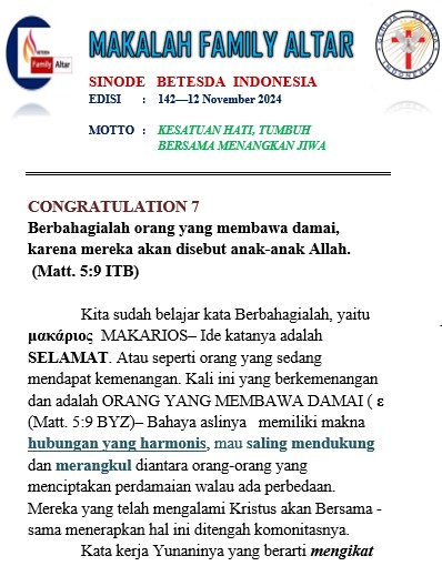 Berbahagialah orang yang membawa damai, karena mereka akan disebut anak-anak Allah.  (Matt. 5:9 ITB)   Kita sudah belajar kata Berbahagialah, yaitu μακάριος  MAKARIOS– Ide katanya adalah SELAMAT. Atau seperti orang yang sedang mendapat kemenangan. Kali ini yang berkemenangan dan adalah ORANG YANG MEMBAWA DAMAI ( ε (Matt. 5:9...