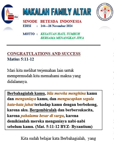 Matius 5:11-12   Mari kita melihat terjemahan lain untuk mempermudah kita memahami makna yang didalamnya.   Berbahagialah kamu, bila mereka menghina kamu dan menganiaya kamu, dan mengucapkan segala kata-kata jahat terhadap kamu dengan berbohong, karena aku. Bergembiralah dan berbersukacita, karena pahalamu besar di surga, karena demikianlah mereka menganiaya nabi-nabi...