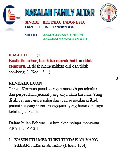 Kasih itu sabar; kasih itu murah hati; ia tidak cemburu. Ia tidak memegahkan diri dan tidak sombong. (1 Kor. 13:4 )   PENDAHULUAN Jemaat Korintus penuh dengan masalah perselisihan dan perpecahan, jemaat yang kaya akan karunia. Yang di akibat guru-guru palsu dan juga persoalan pribadi jemaat itu yang...