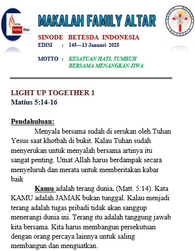 Matius 5:14-16   Pendahuluan: Menyala bersama sudah di serukan oleh Tuhan Yesus saat khotbah di bukit. Kalau Tuhan sudah menyerukan untuk menyalah bersama artinya itu sangat penting. Umat Allah harus berdampak secara menyeluruh dan merata untuk memberitakan kabar baik Kamu adalah terang dunia. (Matt. 5:14). Kata KAMU adalah...