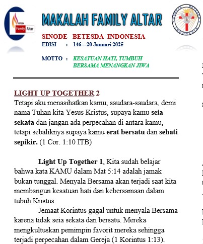 Tetapi aku menasihatkan kamu, saudara-saudara, demi nama Tuhan kita Yesus Kristus, supaya kamu seia sekata dan jangan ada perpecahan di antara kamu, tetapi sebaliknya supaya kamu erat bersatu dan sehati sepikir. (1 Cor. 1:10 ITB)   Light Up Together 1, Kita sudah belajar bahwa kata KAMU dalam...