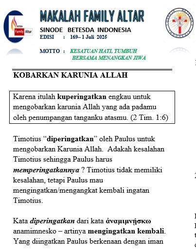 Karena itulah kuperingatkan engkau untuk mengobarkan karunia Allah yang ada padamu oleh penumpangan tanganku atasmu. (2 Tim. 1:6) Timotius “diperingatkan” oleh Paulus untuk mengobarkan...