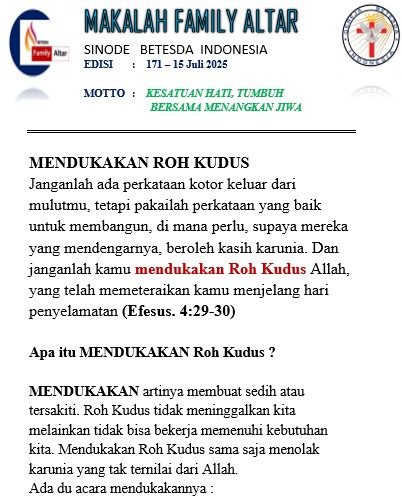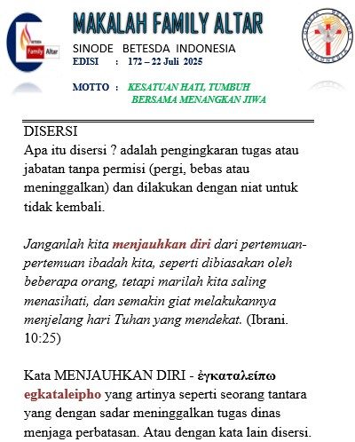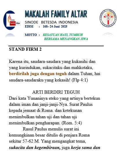 Jika engkau tawar hati pada masa kesesakan, kecillah kekuatanmu. (Amsal. 24:10) Karena itu, saudara-saudara yang kukasihi dan yang kurindukan, sukacitaku dan mahkotaku, berdirilah juga...