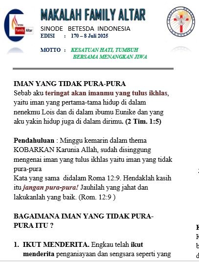 Sebab aku teringat akan imanmu yang tulus ikhlas, yaitu iman yang pertama-tama hidup di dalam nenekmu Lois dan di dalam ibumu Eunike dan...