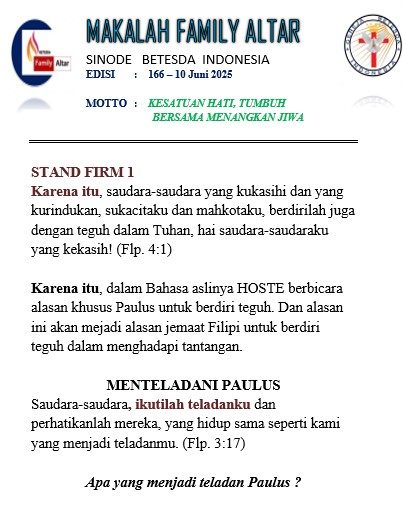 Karena itu, saudara-saudara yang kukasihi dan yang kurindukan, sukacitaku dan mahkotaku, berdirilah juga dengan teguh dalam Tuhan, hai saudara-saudaraku yang kekasih! (Flp. 4:1) Karena...
