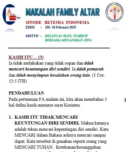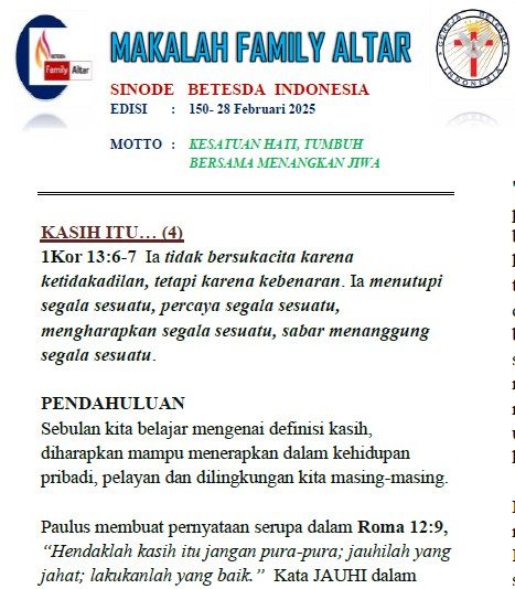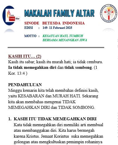 Kasih itu sabar; kasih itu murah hati; ia tidak cemburu. Ia tidak memegahkan diri dan tidak sombong. (1 Kor. 13:4 ) PENDAHULUAN Minggu kemarin kita...