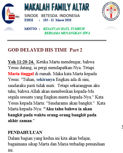 Yoh 11:5-7 Yesus memang mengasihi Marta dan kakaknya dan Lazarus. Namun setelah didengar-Nya, bahwa Lazarus sakit, Ia sengaja tinggal dua hari lagi di tempat,...